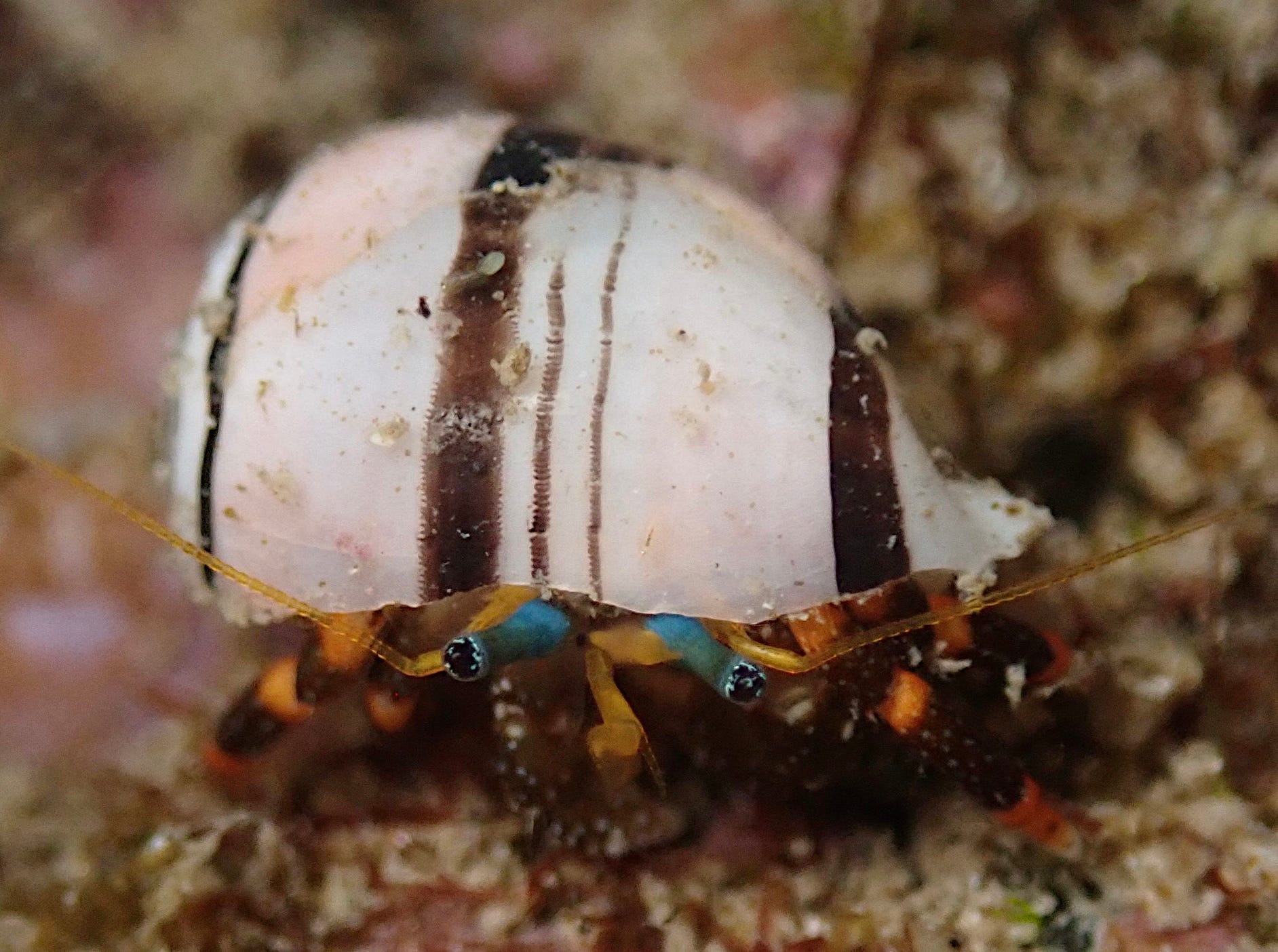 And of course, when their lives are done, all this extravagance goes away, and all that’s left for us to find is the mundane-looking shell, which we barely notice. Others might find it and very much notice it, though. Here’s a hermit crab in a Pink Bubble Snail shell: